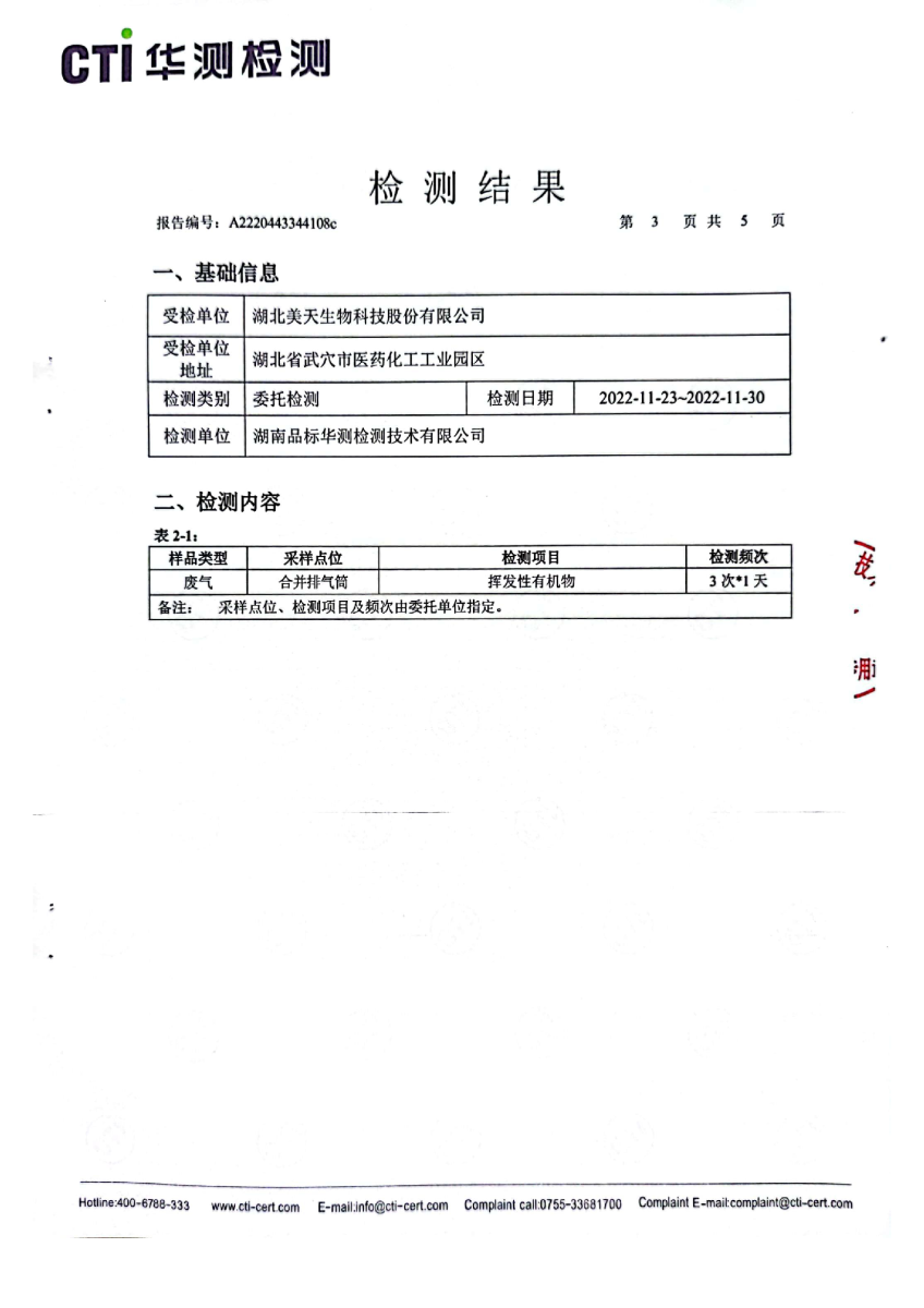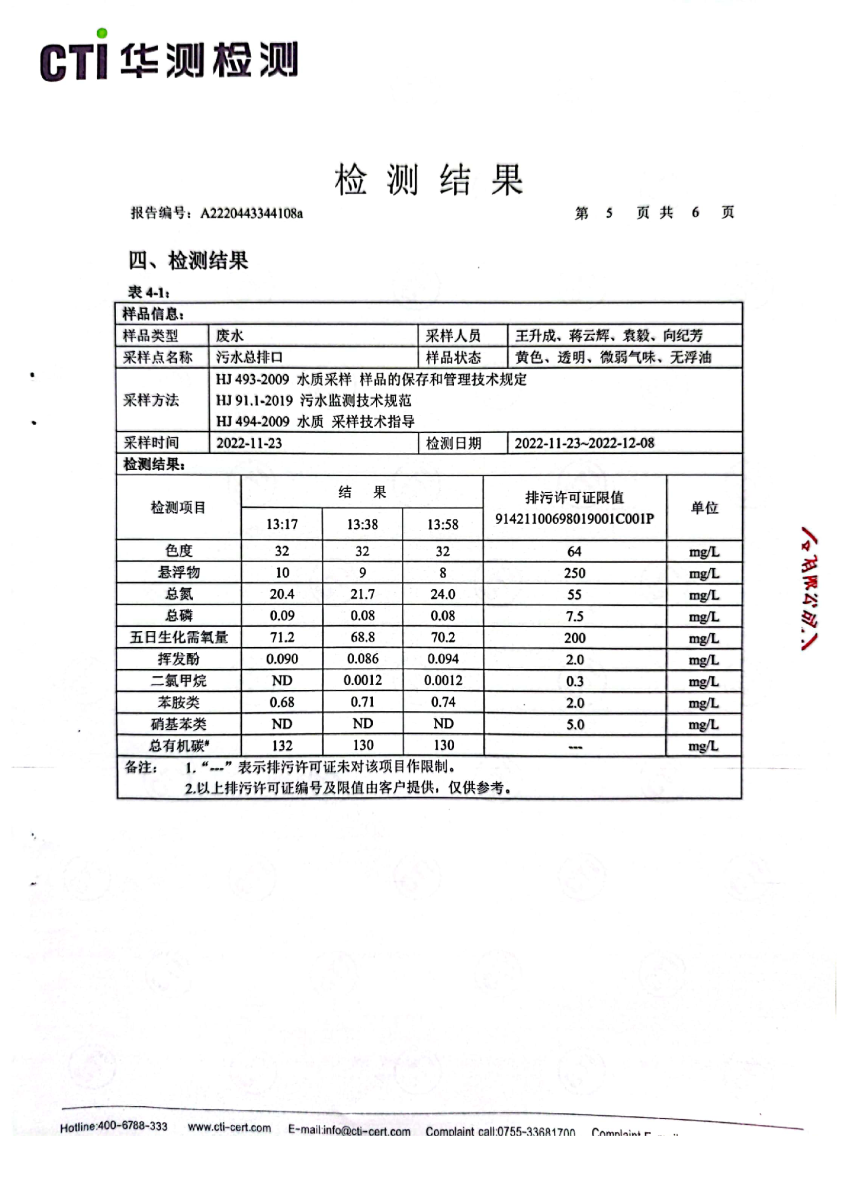 2022年第四季度,公司按照国家企业安全生产标准,对公司所排出的污染源,委托第三方进行抽样检测,详细的检测报告如下