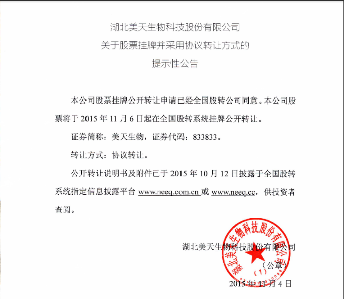 公司自2015年9月24日通过全国中小企业股权转让系统审核后,于2015年11月6日成功在全国中小企业股权转让系统即新三板挂牌上市。股票代码833833。
