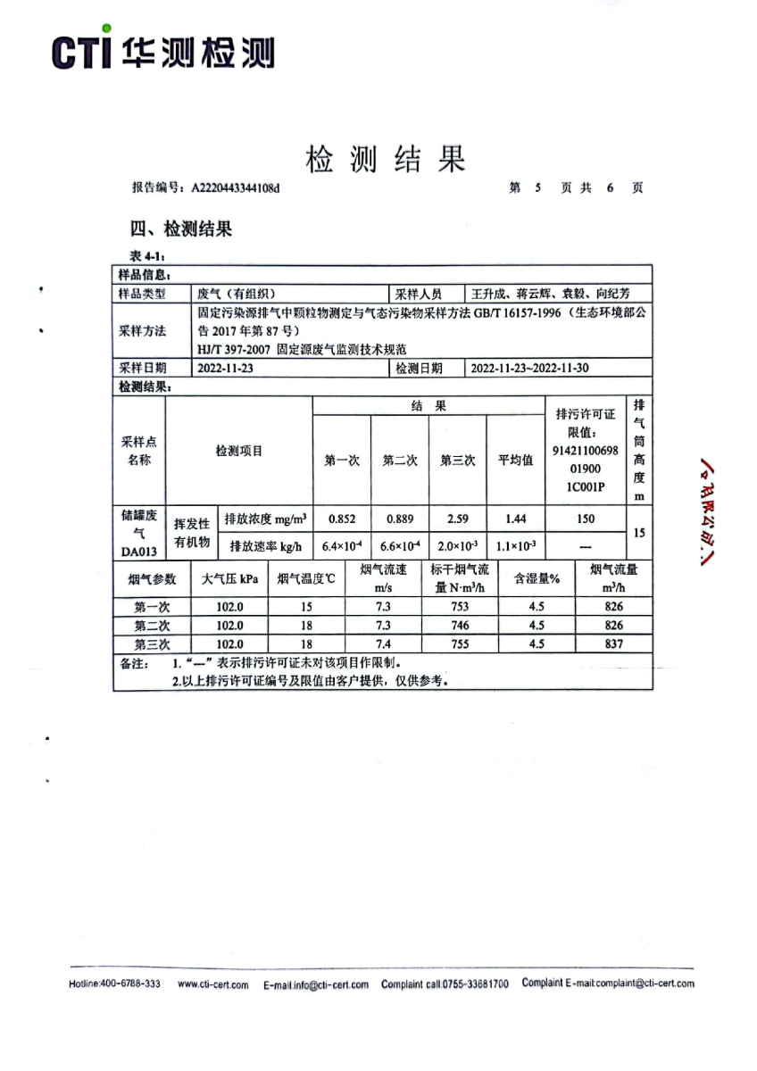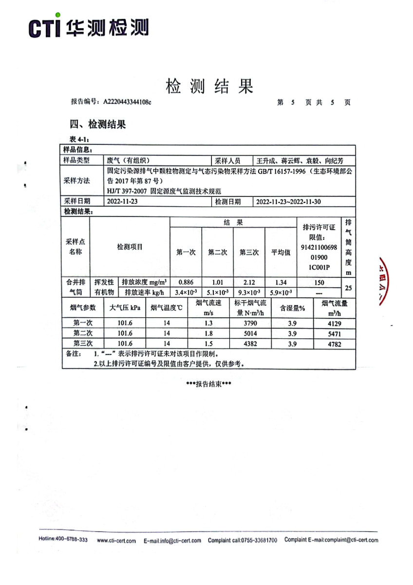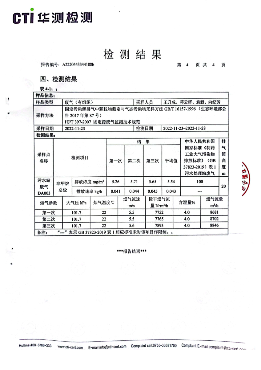 2022年第四季度,公司按照国家企业安全生产标准,对公司所排出的污染源,委托第三方进行抽样检测,详细的检测报告如下