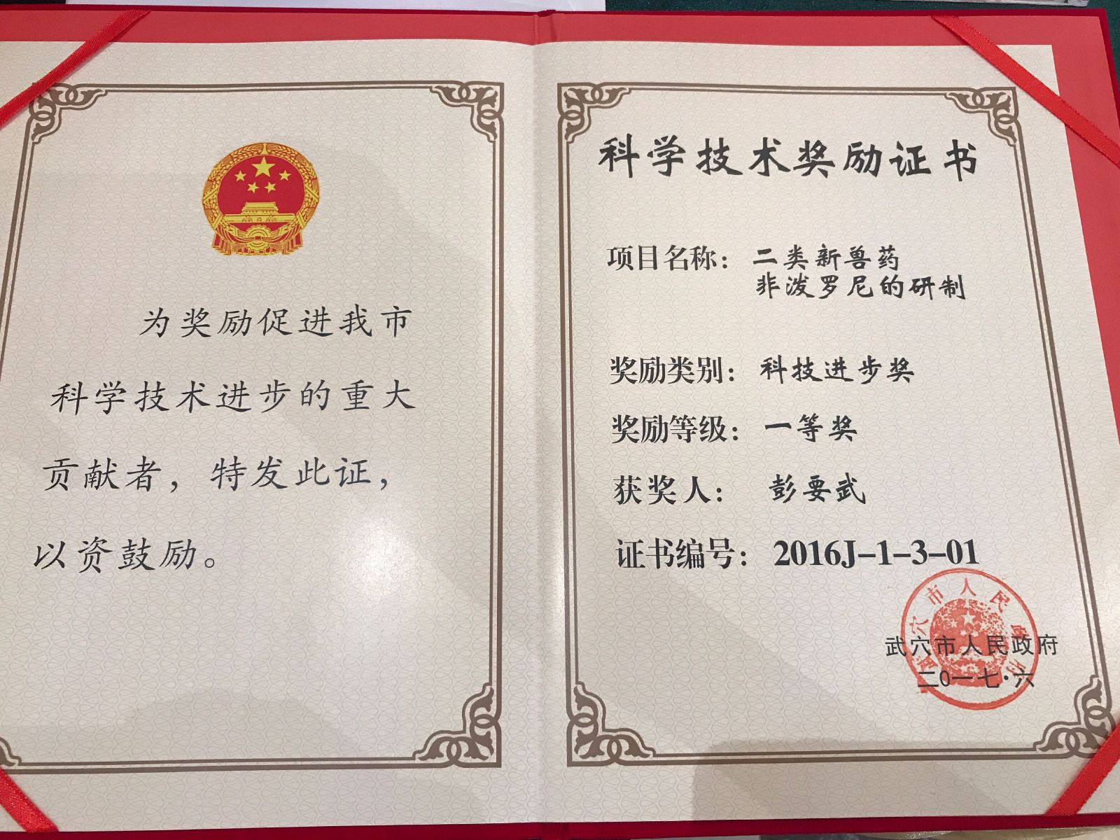KY.COM-开云(中国) 荣获“武穴市十佳科技创新企业”的荣誉称号,公司董事长兼总经理彭要武先生被评为“十佳创新人才”,企业申报的二类新兽药非泼罗尼的研制项目被评为“科技进步一等奖”。参会领导及各组成员对获奖企业和个人表示了热烈的祝贺和高度的赞扬。