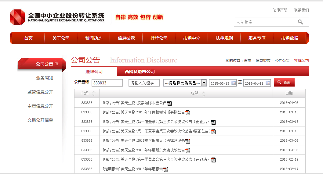 2016年4月8日,全国中小企业股份转让系统发布公告《美天生物股票解除限售公告》。KY.COM-开云(中国) 证券代码为833833,证券简称美天生物,主办券商为申万宏源。本批次股票解除限购数量总额为29682395股,占公司总股份的比例为58.29%,可转让时间为2016年4月15日。具体信息详见公司在股转系统发布2016-007号公告。